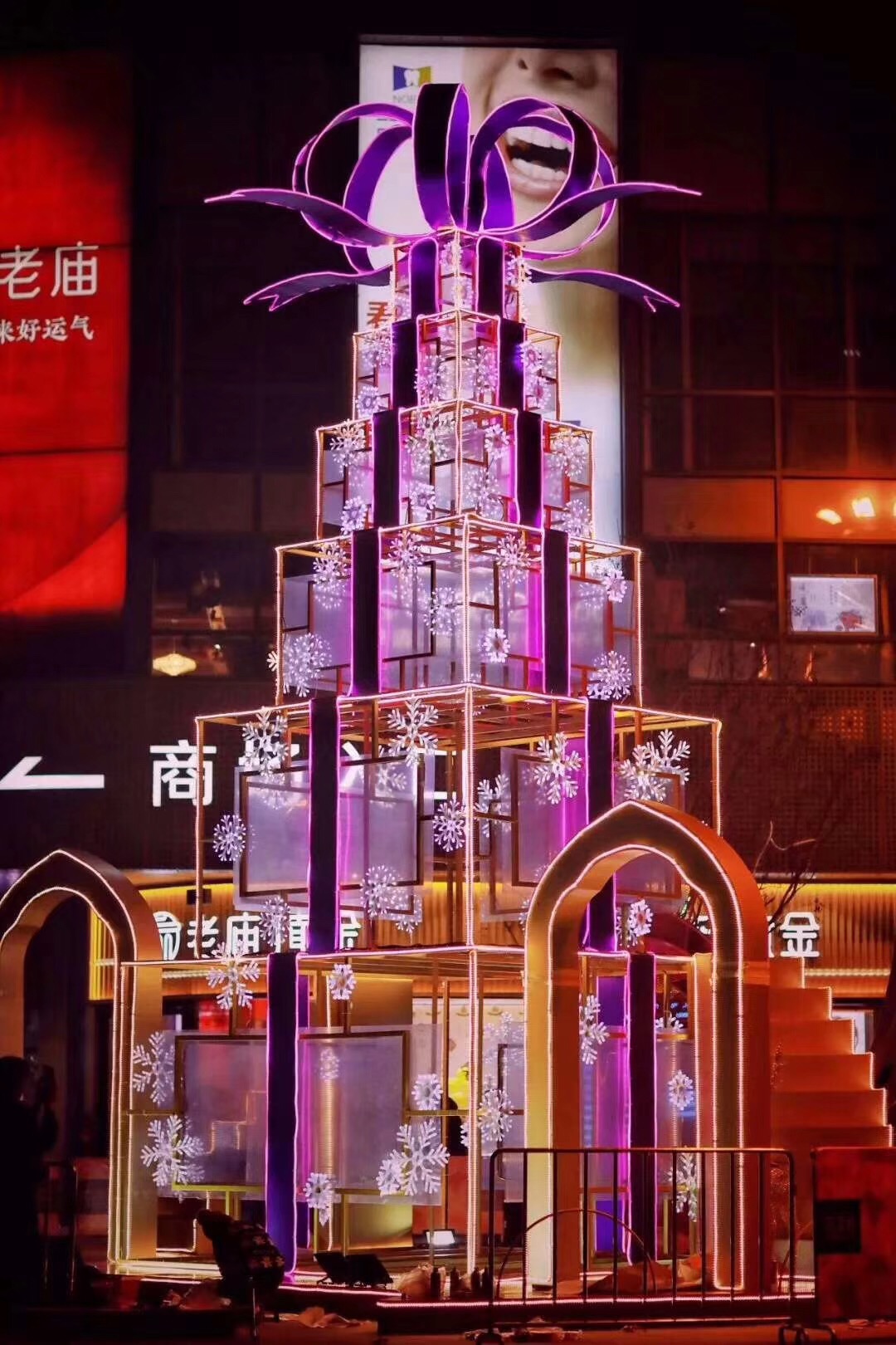 安裝之前天公不作美,天空飄起小雨,為了不耽誤使用,龍君的安裝師傅在雨停后立即進行圣誕樹的組裝,并沒有因為天氣原因想要趕工快速完工而草草了事,每一根燈串,每一層骨架,每一顆固定螺絲,都認真仔細地進行安裝。圣誕樹就安裝在酒店門口,夜幕降臨,點亮圣誕樹,就像點亮了整個黑夜。
