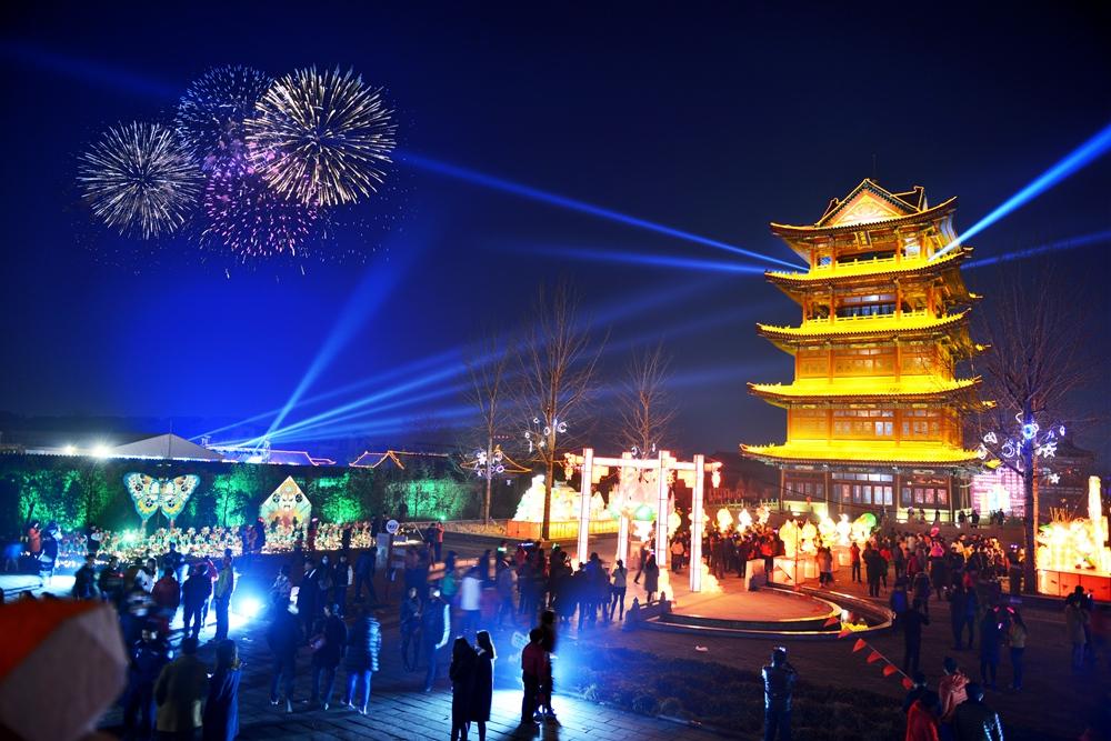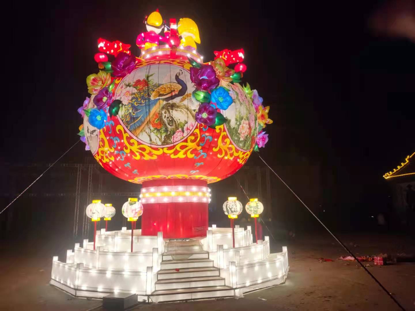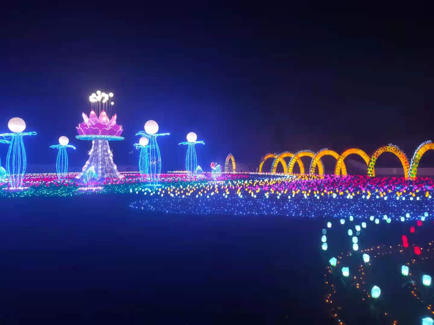 夜幕降臨,華燈初上。景區(qū)樹(shù)立的巨型燈飾由百花爭(zhēng)艷、百鳥朝鳳等幾部分組成,不僅夜間散發(fā)出絢麗光芒,而且內(nèi)容祥瑞吉利,