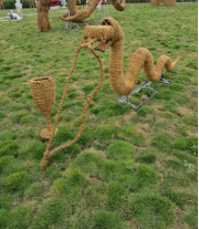 2.中間環(huán)節(jié):以結(jié)構(gòu)件的基礎(chǔ)上用稻草繩做纏繞編扎,用草繩包住整個(gè)結(jié)構(gòu)件, 形成稻草工藝品的外在表象,期間用細(xì)鐵絲或麻繩固定。編扎的細(xì)致、接 頭的固定方式?jīng)Q定稻草工藝品的外觀(guān)質(zhì)量。