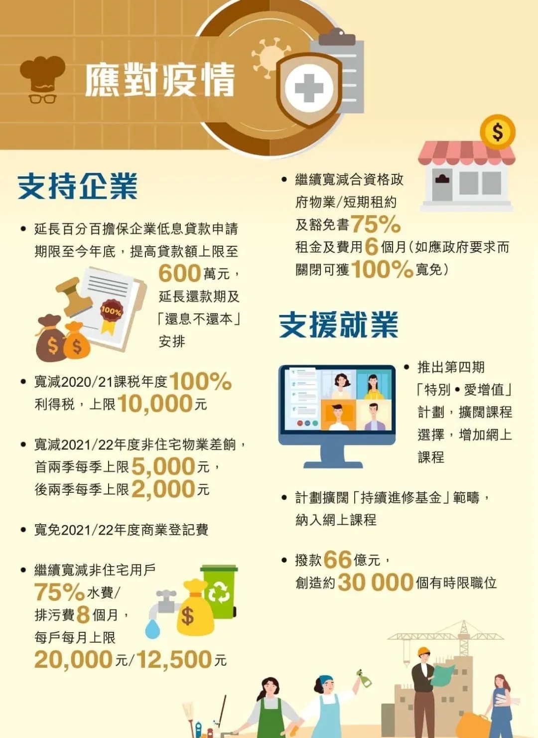 — 寬減2021/22年度非住宅物業(yè)差餉,首兩季每季上限5,000元,后兩季每季上限2,000元;