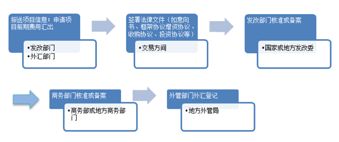 一般而言,中國企業(yè)進(jìn)行海外投資,主要需要取得三個(gè)主管部門(mén)的核準、備案或登記,包括國家發(fā)展和改革委員會(huì )或地方發(fā)展和改革委員會(huì )(下稱(chēng)“發(fā)改部門(mén)”)的核準或備案、商務(wù)部或地方商務(wù)部門(mén)(下稱(chēng)“商務(wù)部門(mén)”)的核準或備案、以及國家外匯管理局地方分局(下稱(chēng)“外管部門(mén)”)的外匯登記程序【2015年6月1日后,外匯登記權限已下放到企業(yè)注冊地銀行】。