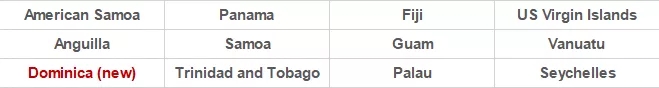 美屬維爾京群島、美屬薩摩亞、安圭拉、多米尼克(新增)、斐濟、關(guān)島、帕勞、巴拿馬、薩摩亞、塞舌爾、瓦努阿圖、特立尼達和多巴哥。