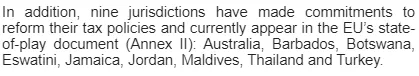 此外,9個(gè)司法管轄區已作出改革其稅收政策的承諾,已從非合作名單除名,但仍處于考察階段,包括澳大利亞、巴巴多斯、博茨瓦納、斯瓦蒂尼、牙買(mǎi)加、約旦、馬爾代夫、泰國和土耳其。