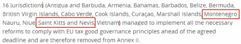 早在2020年2月更新的非合作名單中,就移除了黑山、圣基茨和尼維斯等16個(gè)管轄區,這也意味著(zhù),目前黑山、圣盧西亞、圣基茨均在歐盟稅收白名單之中。