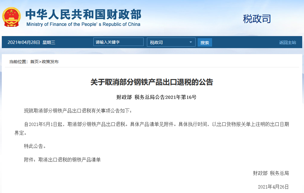 自2021年5月1日起,取消部分鋼鐵產(chǎn)品出口退稅。具體產(chǎn)品清單見(jiàn)附件。具體執行時(shí)間,以出口貨物報關(guān)單上注明的出口日期界定。