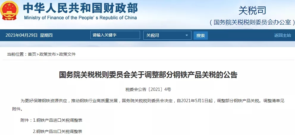 2021年5月1日起我國調整部分鋼鐵產(chǎn)品關(guān)稅及出口退稅率
