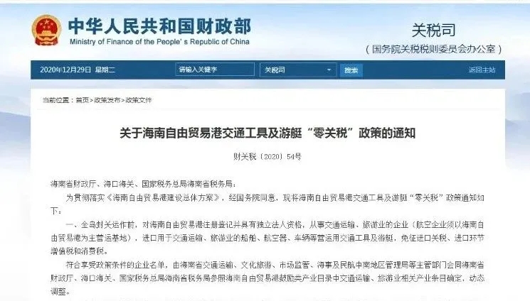12月29日,財政部、海關(guān)總署、稅務(wù)總局公布了《關(guān)于海南自由貿易港交通工具及游艇“零關(guān)稅”政策的通知》(下稱(chēng)《通知》),在海南全島封關(guān)運作前,對海南自由貿易港注冊登記并具有獨立法人資格,從事交通運輸、旅游業(yè)的企業(yè),進(jìn)口用于交通運輸、旅游業(yè)的船舶、航空器、車(chē)輛等營(yíng)運用交通工具及游艇,免征進(jìn)口關(guān)稅、進(jìn)口環(huán)節增值稅和消費稅。