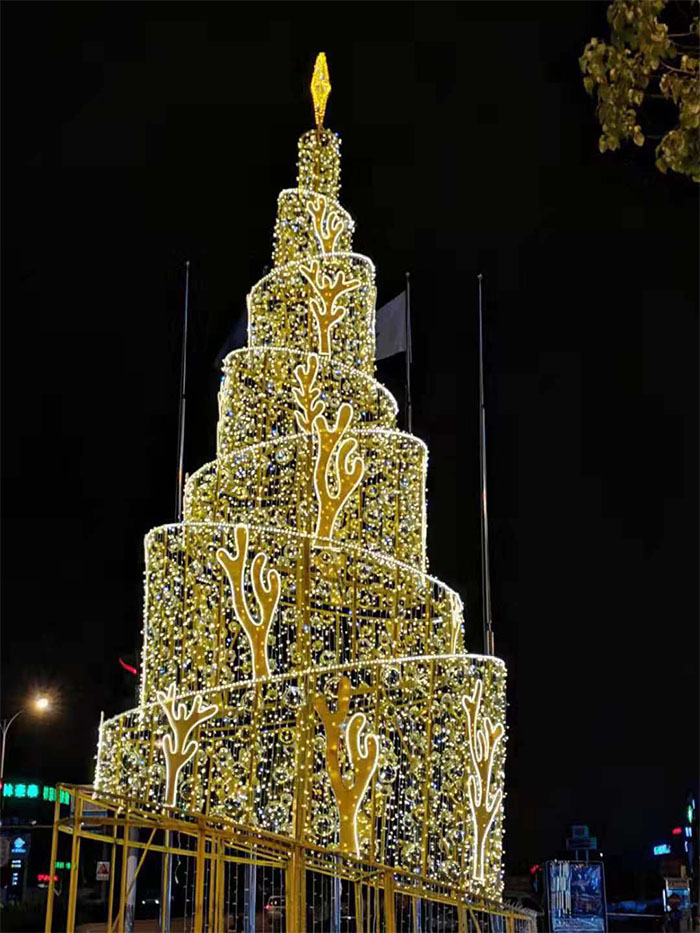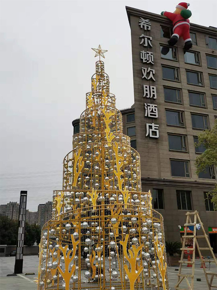 安裝之前天公不作美,天空飄起小雨,為了不耽誤使用,龍君的安裝師傅在雨停后立即進行圣誕樹的組裝,并沒有因為天氣原因想要趕工快速完工而草草了事,每一根燈串,每一層骨架,每一顆固定螺絲,都認真仔細地進行安裝。圣誕樹就安裝在酒店門口,夜幕降臨,點亮圣誕樹,就像點亮了整個黑夜。