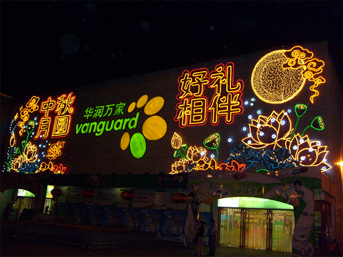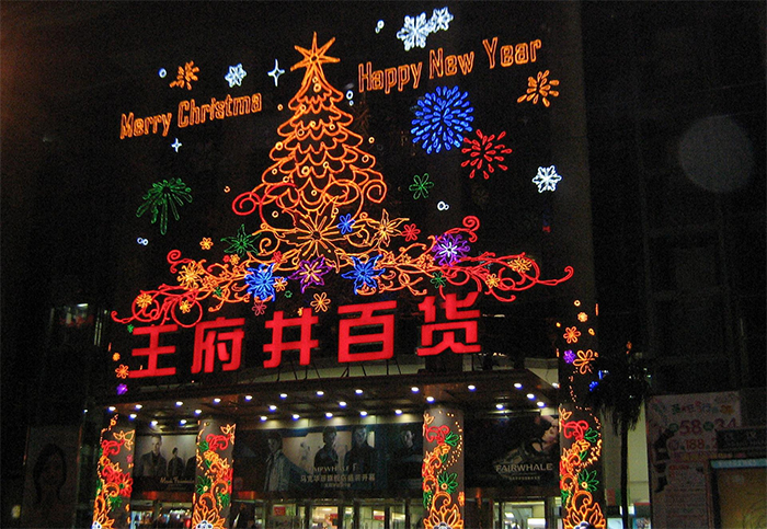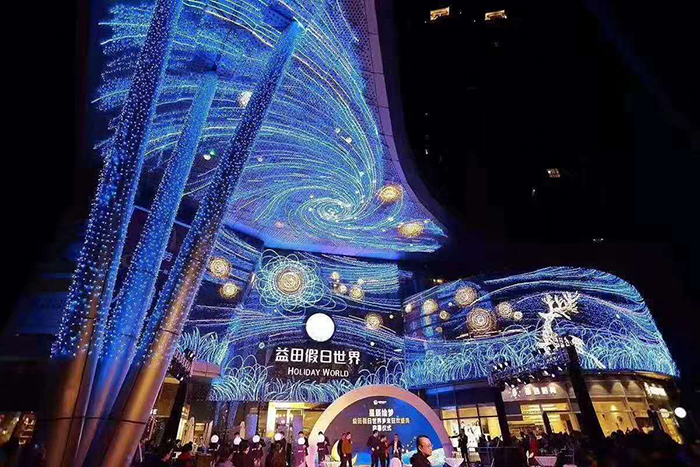 商場外墻搭配商場外面的空間同進行亮化處理,效果可能會更好,當然這是建立在商場外面具有足夠的空間的前提下。例如商場的廣場上搭配使用具有節(jié)日氣息的燈光造型,使商場節(jié)日氛圍更加濃烈,從而為顧客營造一種更加舒適、歡快的購物氛圍。