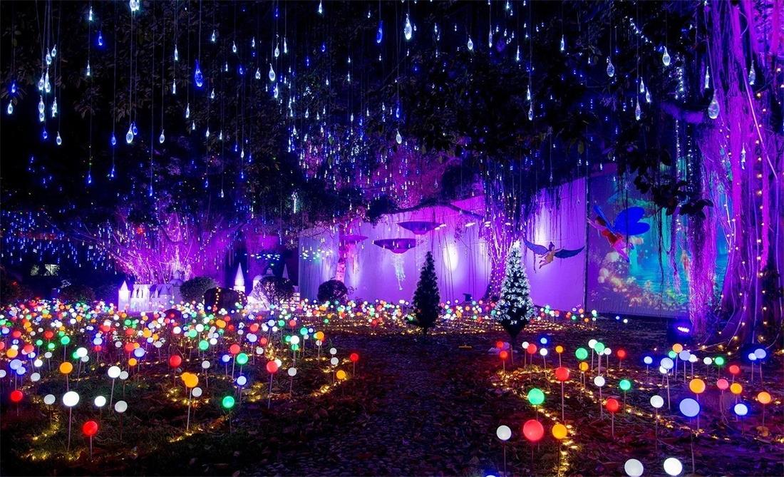 水滴裝飾樹木亮化。其實(shí),大樹樹枝已經(jīng)無(wú)需使用串燈進(jìn)行亮化,地面上五彩的插地圓球燈已經(jīng)將周圍的環(huán)境照的透亮,樹枝上只加了一些“搖搖欲墜”的水滴,就足夠美麗了??吹竭@樣的美景,真的會(huì)忍不住將它定格在手機(jī)相冊(cè)里。