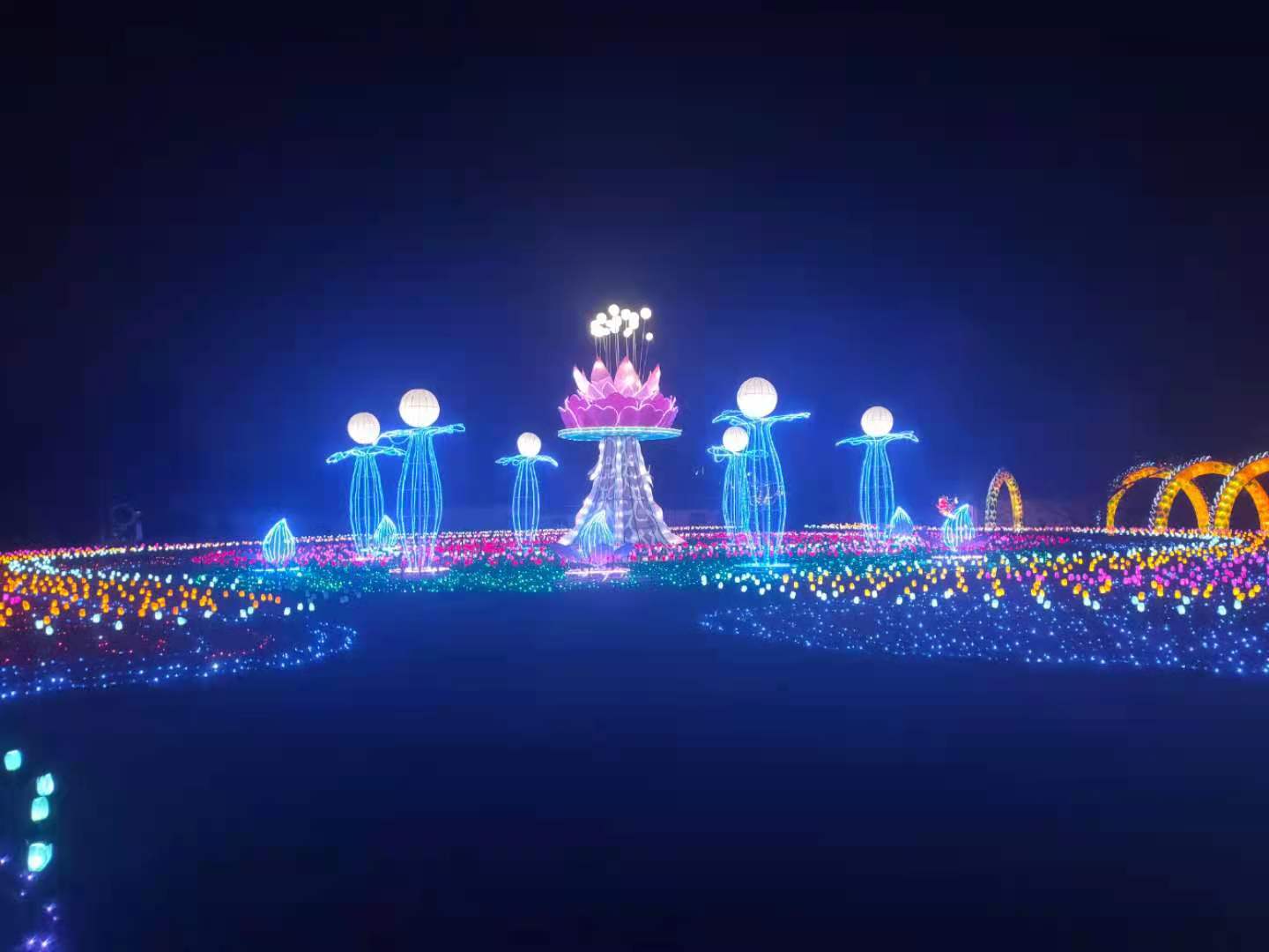 夜幕降臨,華燈初上。景區(qū)樹(shù)立的巨型燈飾由百花爭(zhēng)艷、百鳥朝鳳等幾部分組成,不僅夜間散發(fā)出絢麗光芒,而且內(nèi)容祥瑞吉利,