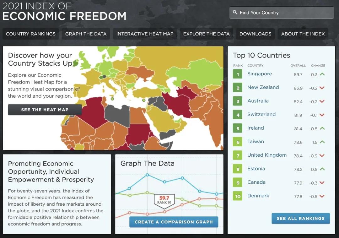 在今年的全球權威的經(jīng)濟自由度評價(jià)指標中,由《華爾街日報》和美國傳統基金會(huì )發(fā)布的2021年度報告中,新加坡成為全球最自由經(jīng)濟體。在加拿大菲沙研究所最新發(fā)表的《世界經(jīng)濟自由度2020年度報告》中,新加坡排名第二。